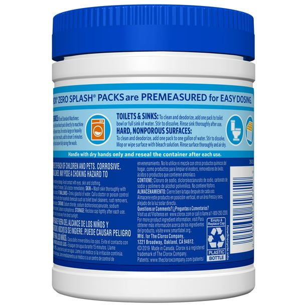 About this itemProduct detailsClorox Zero Splash Bleach Packs bring you the Clorox Bleach clean in a convenient pre-measured solid pack for easy dosing. The solid bleach packs allow you to enjoy whiter laundry and cleaner surfaces without the splash and spills. Clorox Zero Splash Bleach Packs are a convenient solution for cleaning fabrics, toilets, sinks and hard, nonporous surfaces. These specially formulated packs activate upon contact with water for added control. Simply throw a Bleach Pack in the washer drum or drop a pack into a bucket, sink or toilet and stir to dissolve. The packs will dissolve fully in the wash. These compact bleach pods make it easy to grab a pack or two of these and go. No mess, just fresh clean clothes. Clorox Zero Splash Bleach Packs let you clean with the same trusted Clorox power without worrying about bleach spills, splatters or other laundry mishaps. CLOROX BLEACH: Clorox Bleach Packs are a controlled way to clean with bleach in a convenient pod! Use these packs as you would liquid bleach with laundry detergent BLEACH PODS: The laundry pods are filled with water activated solid bleach crystals so you can easily control the way you clean SPLASHLESS BLEACH: No more worrying about bleach spills or splashes, these bleach tablets for laundry allow you to enjoy the same great Clorox Bleach liquid in a form thats easier than ever to use MULTIPURPOSE BLEACH: Great for everyday cleaning, take this bleach out of the laundry room and use on household surfaces including countertops, floors, toilets and more LAUNDRY BLEACH: Use in standard and high efficiency washing machines to fight tough stains and keep your whites white error:We aim to show you accurate product information. Manufacturers, suppliers and others provide what you see here, and we have not verified it. See our disclaimer